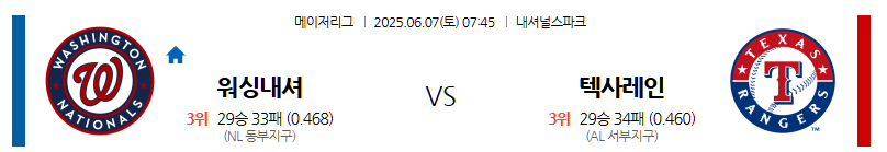 ▶ 2025년 6월 7일 07:45 (한국 시각) | 내셔널스 파크 | MLB (메이저리그 야구) | 워싱턴 내셔널스 vs 텍사스 레인저스